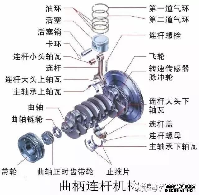 曲柄连杆机构是发动机的主要运动机构。其功能是将活塞的往返运动转变为曲轴的旋转运动,同时将作用于活塞上的力转变为曲轴对外输出的转矩,以驱动汽车车轮转动。曲柄连杆机构由活塞连杆组、曲轴飞轮组的零件组成。曲柄连杆机构总体构造如下图所示。