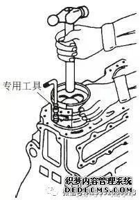⑦ 用橡胶锤或铁锤木柄推出活塞连杆组,注意不要倾斜,不要硬撬、硬敲,以免损坏气缸。