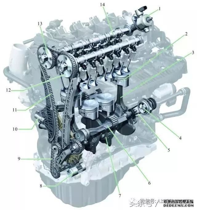 1-高压燃油泵;2-活塞;3-连杆;4-冷却液泵;5-冷却液泵驱动皮带;6-平衡轴;7-曲轴;8-可调式外部齿轮机油泵;9-机油泵驱动链条;10-链条张紧器;11-齿形皮带传动;12-进气凸轮轴调节器;13-排气凸轮轴调节器;14-具有气门行程切换功能的排气凸轮轴