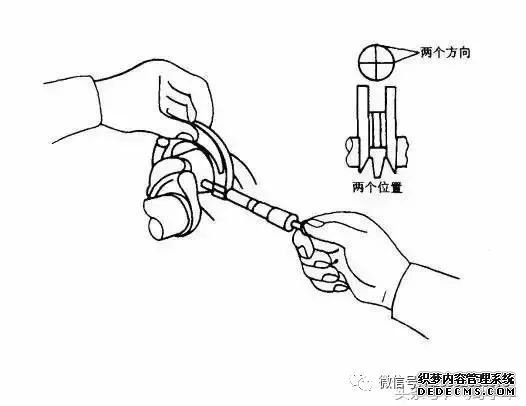② 用夹具收紧各环。按活塞顶部装配标记将活塞连杆从气缸顶部装入缸筒,用手引导连杆使其对准曲柄销,用木锤柄将活塞轻轻推入。