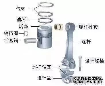 连杆组的功用是将活塞承受的力传给曲轴,并将活塞的往复运动转变为曲轴的旋转运动。活塞连杆组的构造如下图所示。
