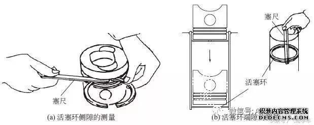 用塞尺检查活塞环的端隙,如下图中(b)所示。倒置活塞,用其顶部将活塞环垂直推入气缸,在离气缸顶面15mm 处进行测量。
